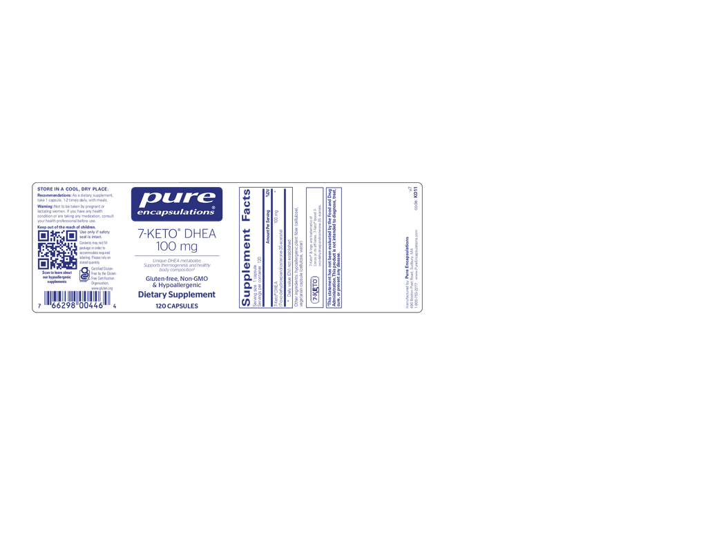 7-KETO® DHEA 100 mg Supplemental Facts Amount Per Serving each vegetarian capsule contains: 7-Keto® DHEA (7-oxo-dehydroepiandrosterone-3β-acetate) 100 mg other ingredients: hypoallergenic plant fiber (cellulose), vegetarian capsule (cellulose, water) 7-Keto® & logo are trademarks of Lonza or its affiliates. 7-Keto® brand 7-oxo-dehydroepiandrosterone-3β-acetate. Not to be taken by pregnant or lactating women. 1 capsule, 1-2 times daily, with meals.