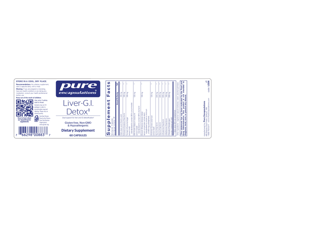 Liver-G.I. Detox‡ Supplemental Facts Amount Per Serving two vegetarian capsules contain: alpha lipoic acid (thioctic acid) 100 mg n-acetyl-l-cysteine (free-form) 100 mg turmeric (Curcuma longa) extract (root) 100 mg (standardized to contain 95% curcuminoids) milk thistle (Silybum marianum) extract (seed) 125 mg (standardized to contain 80% silymarin) broccoli (Brassica oleracea italica) sprout concentrate (whole plant) 100 mg (standardized to contain a minimum of 400 mcg sulforaphane) artichoke (Cynara scolymus) extract (leaf) 125 mg taurine (free-form) 225 mg glycine (free-form) 225 mg l-glutamine (free-form) 225 mg l-methionine (free-form) 100 mg chlorella (Chlorella spp.) powder (cracked cell wall) 200 mg other ingredients: vegetarian capsule (cellulose, water), ascorbyl palmitate 2 capsules daily, with a meal.