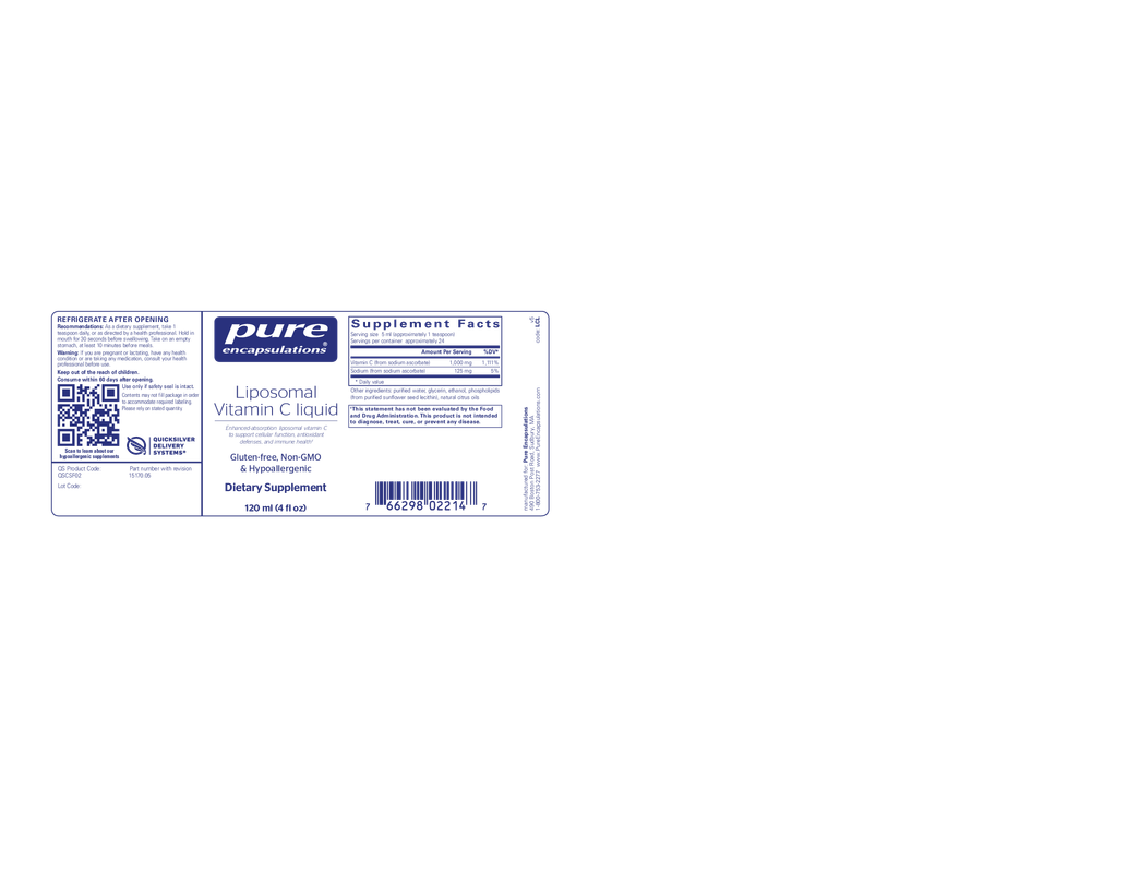 Supplement Facts Serving size 5 ml (approximately 1 teaspoon) Servings per container approximately 24 Amount Per Serving, %DV Vitamin C (as sodium ascorbate) 1000 mg, 1111% Sodium (as sodium ascorbate) 125 mg, 5% Phospholipids (from sunflower) 250 mg, * * Daily value (DV) not established Other ingredients: purified water, glycerin, ethanol, natural citrus oils Warning: If you are pregnant or lactating, have any health condition or are taking any medication, consult your health professional before use. Keep out of the reach of children. Consume within 30 days after opening