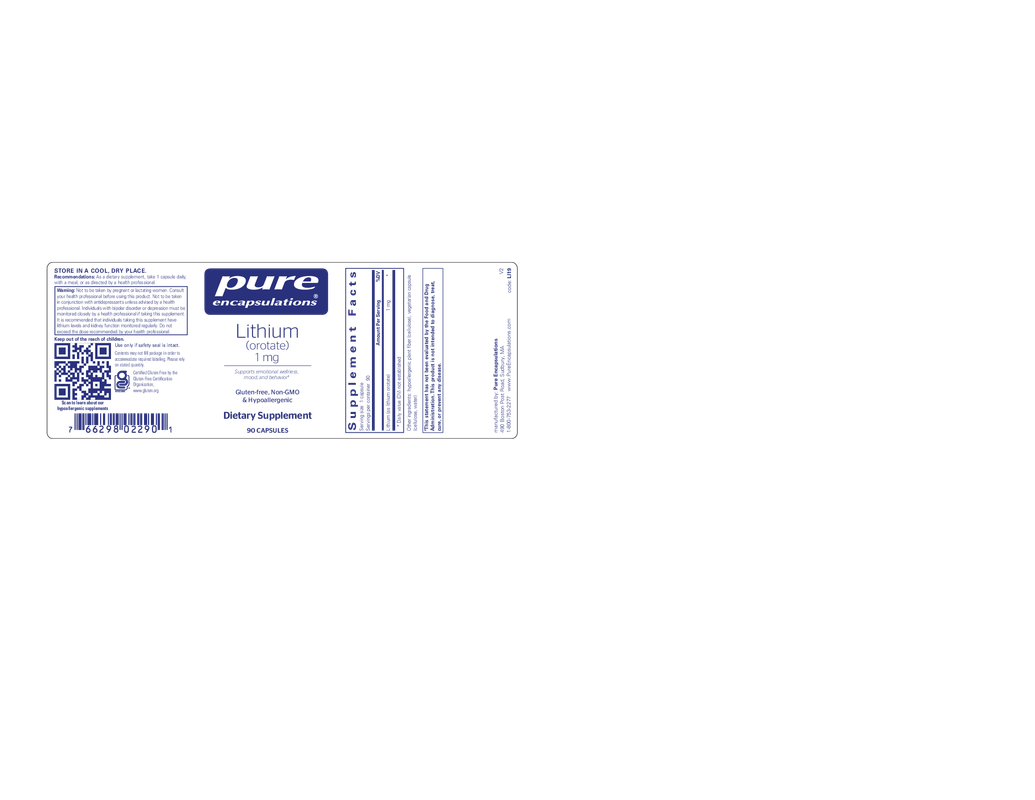 Lithium (orotate) 1 mg Supplemental Facts Amount Per Serving each vegetarian capsule contains: lithium (as lithium orotate) 1 mg other ingredients: hypoallergenic plant fiber (cellulose), vegetarian capsule (cellulose, water) Not to be taken by pregnant or lactating women. Consult your health professional before using this product. Not to be taken in conjunction with antidepressants unless advised by a health professional. Individuals with bipolar disorder or depression must be monitored closely by a health professional if taking this supplement. It is recommended that individuals taking this supplement have lithium levels and kidney function monitored regularly. Do not exceed the dose recommended by your health professional. 1 capsule daily, with a meal, or as directed by a health professional.